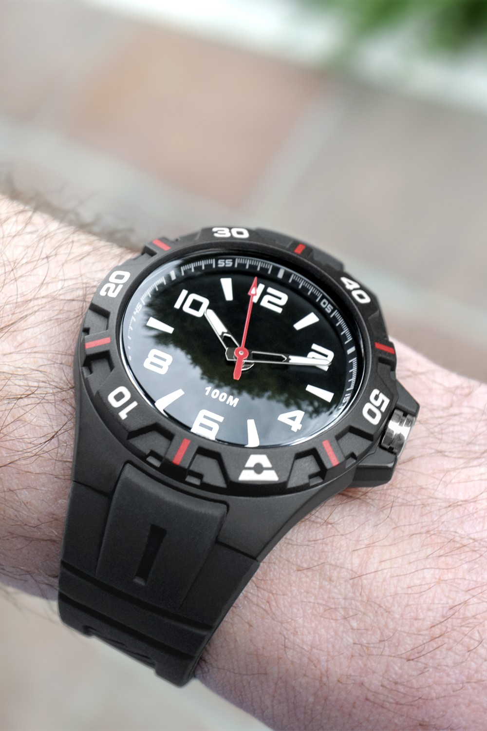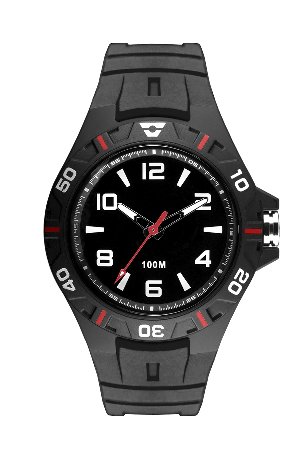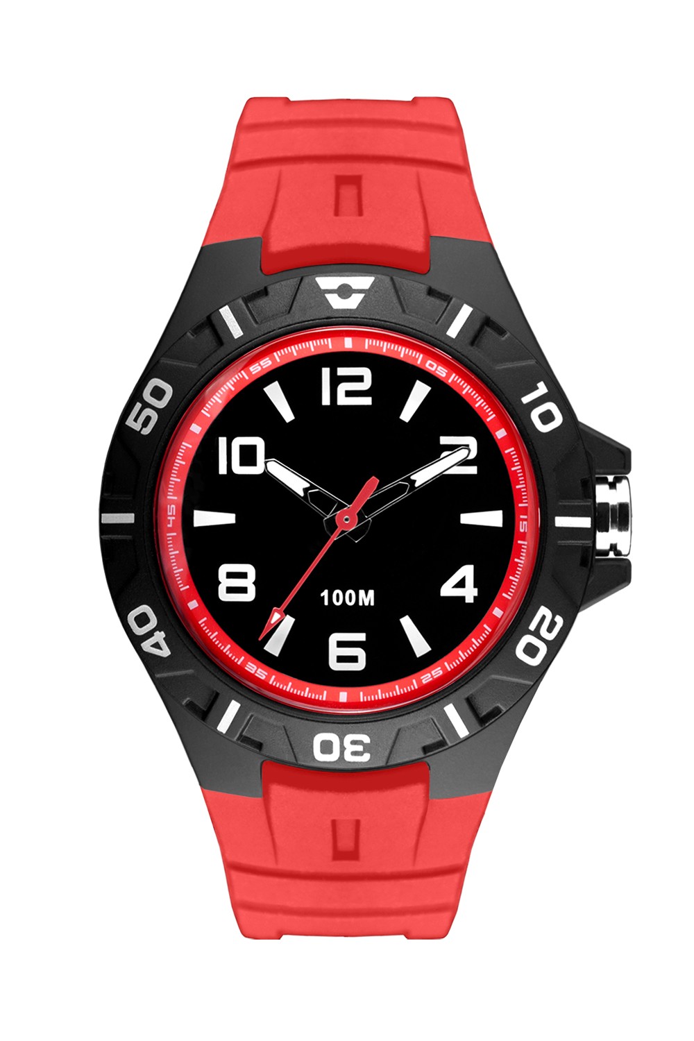 Sportief quartzhorloge met draaibare duikersring en rubber band, leverbaar in blauw, zwart en rood.