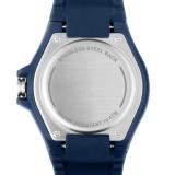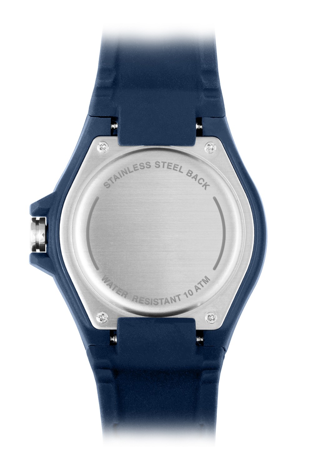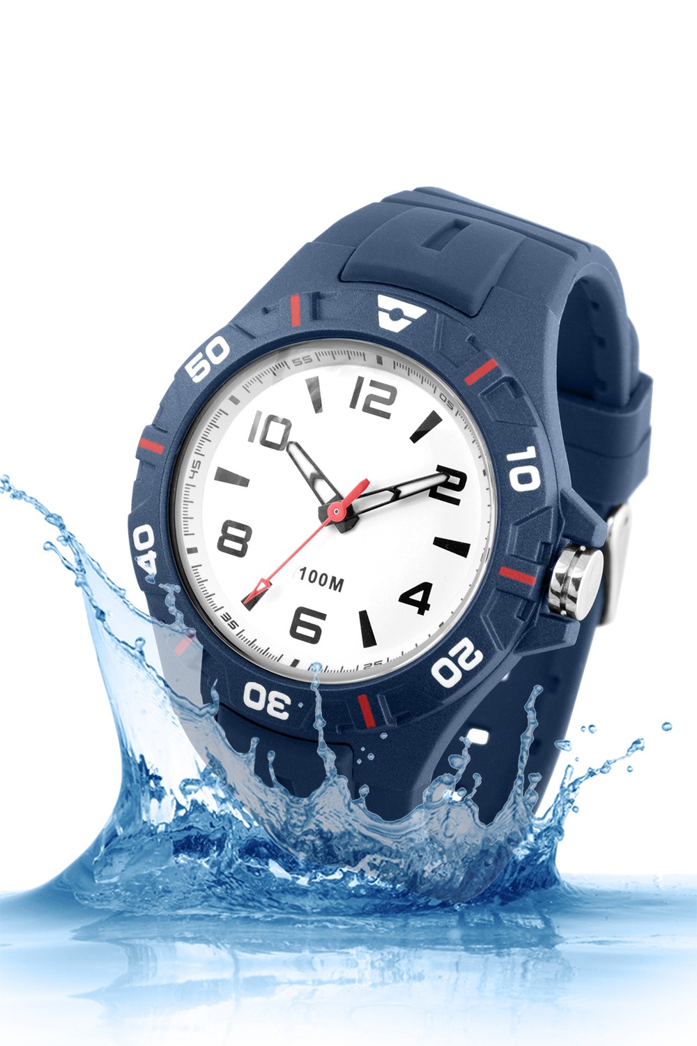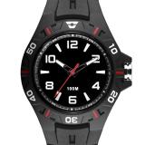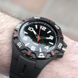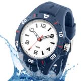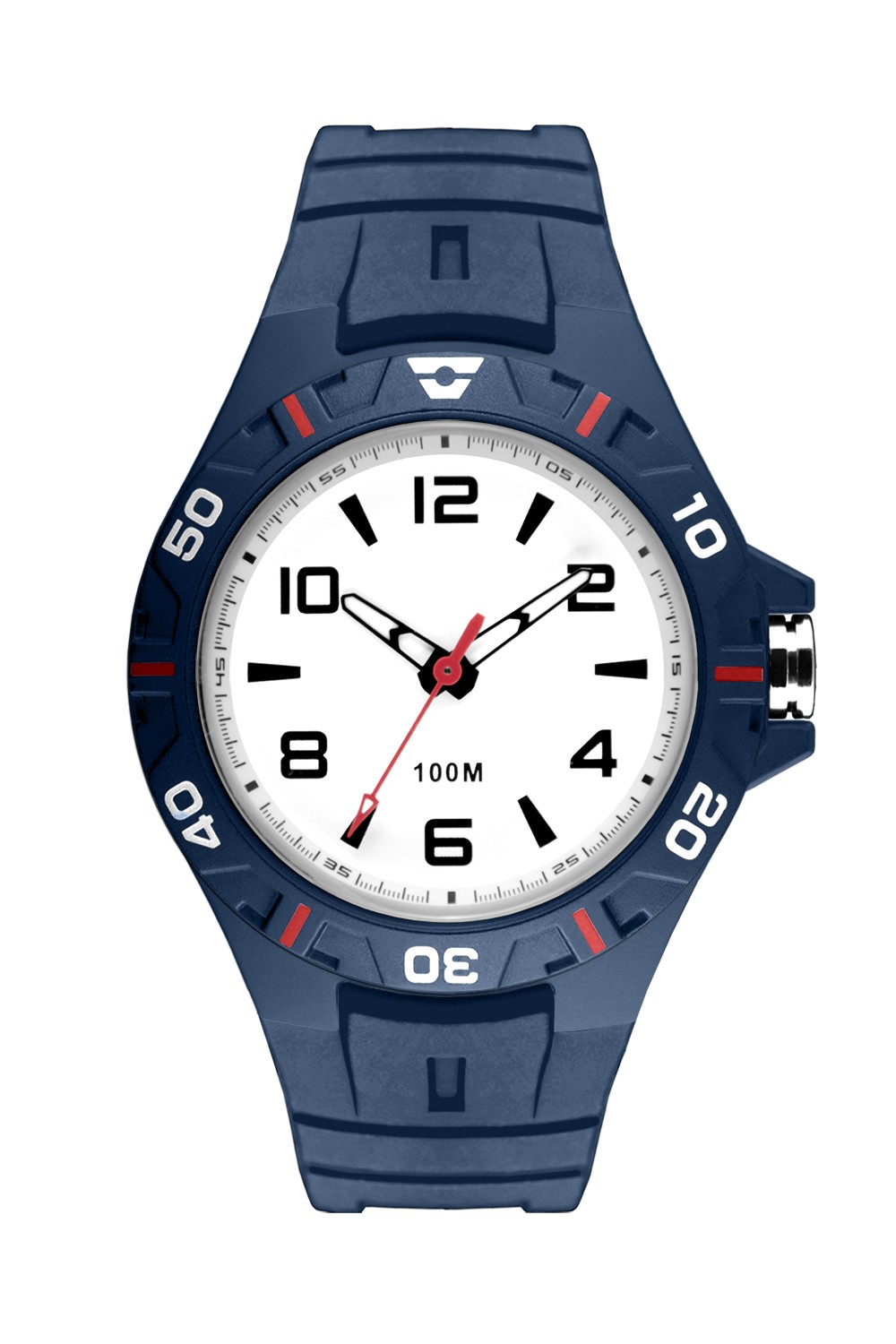 Sportief quartzhorloge met draaibare duikersring en rubber band, leverbaar in blauw, zwart en rood.