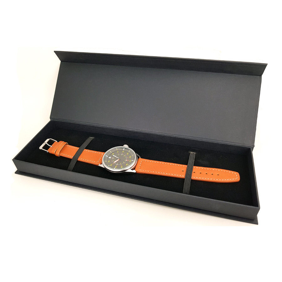 Langwerpig model voor 1 of 2 horloges met opdruk mogelijkheid, zwart luxe kartonnen afwerking aan de buitenzijde, binnenzijde met zwart fluwelen afwerking, afm. 300x95x27mm